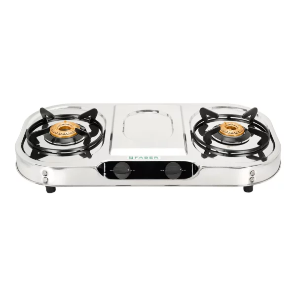 The Faber Cook Top COOKTOP CRYSTAL 2BB SS is a gas cooktop with a manual ignition system and a stainless steel body.